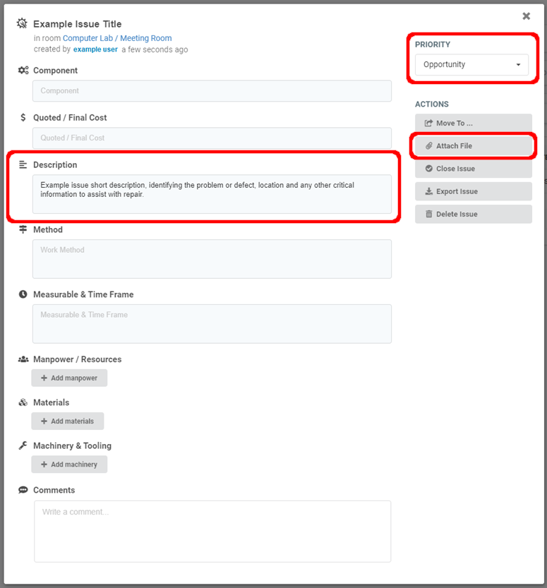 - Priority – Detail how urgently issue needs to be rectified.