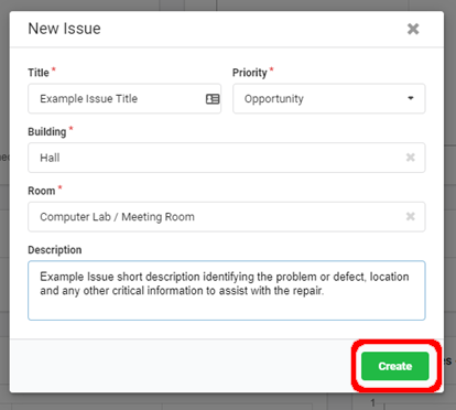 NOTE: The following method outlines the recommended way to quickly create a new issue/maintenance request. New issues can also be created from within the structure (e.g. building, room) that the issue pertains to.