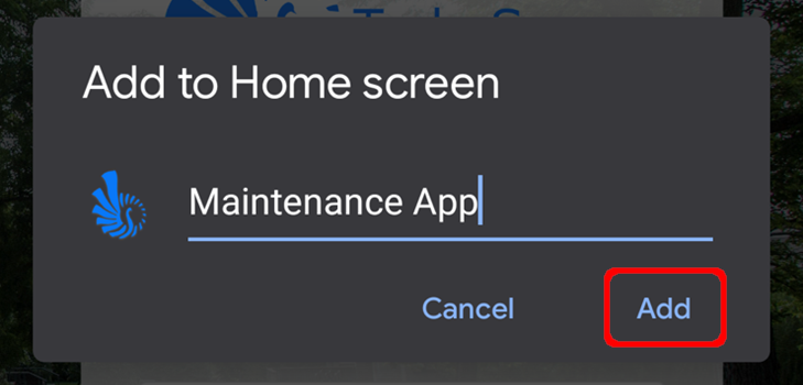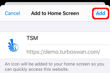 Step 4 – A second Pop-up will display of the Home Screen Icon and name – press the “add” button.