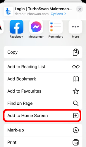 Step 3 – Pop-up will display for the website. Scroll down to the actions list and press the “Add to Home Screen” button.